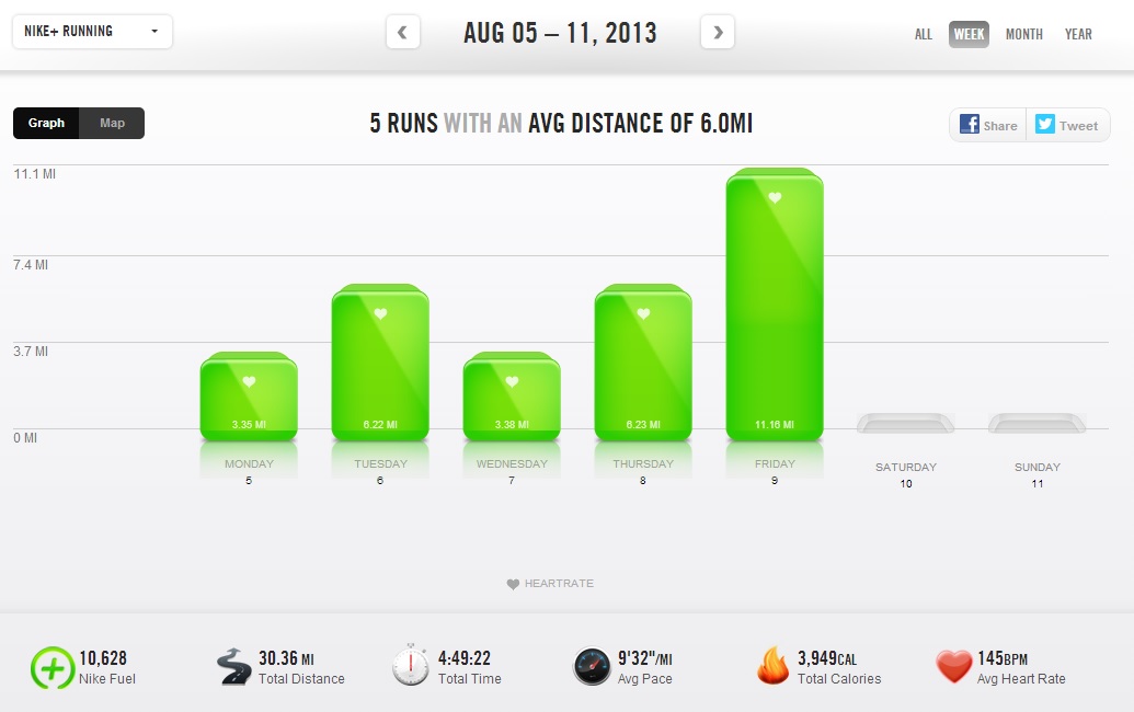Because of a family trip to Lancaster County, PA this weekend I had to squeeze my runs into the work week so I missed out on cross training on Monday and missed my rest day on Friday. I rested over the weekend (if you can call a family vacation a rest).
