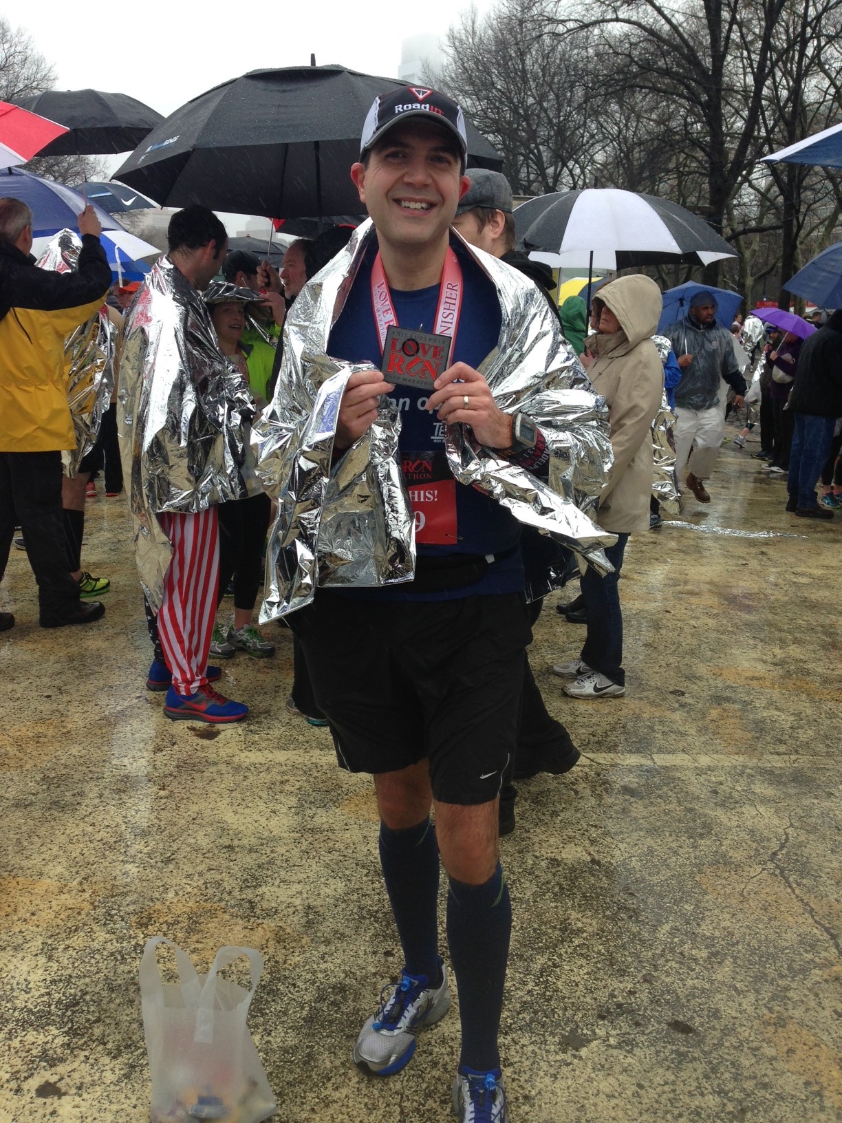 I waited around for Mike to finish. Unfortunately there were no places to take shelter so by the time we finally met up I was so cold I was visibly shaking. We had a hard time reaching each other at the finish line as our phones and fingers were so wet our iPhones became practically inoperable. I couldn’t answer calls because my fingers swipes had no effect on the phone. Hmm…technology is fabulous until it stops working on you.