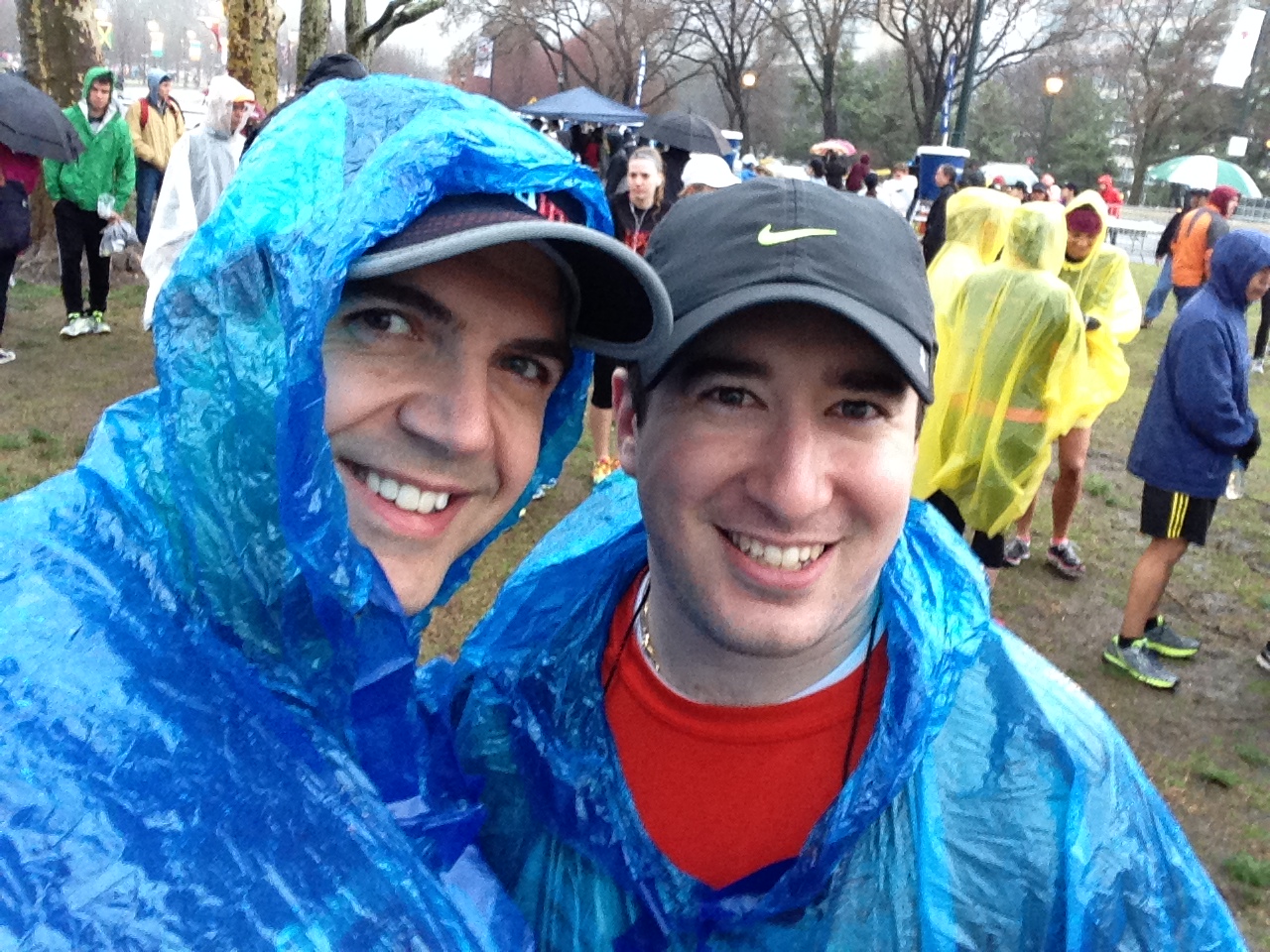 As we arrived at the starting area the weather was a little misty and had started to rain lightly. As we waited for our turn to the port-a-potties the ground was already damp due to the previous days rainfall and was already getting a little muddy and squishy (that’s a very scientific description). As we were getting ready to check our bags I pulled out a poncho I had packed and realized I had two. It was Mike’s lucky day!! Glad I saved these from our trip to Niagara Falls back in 2012 🙂