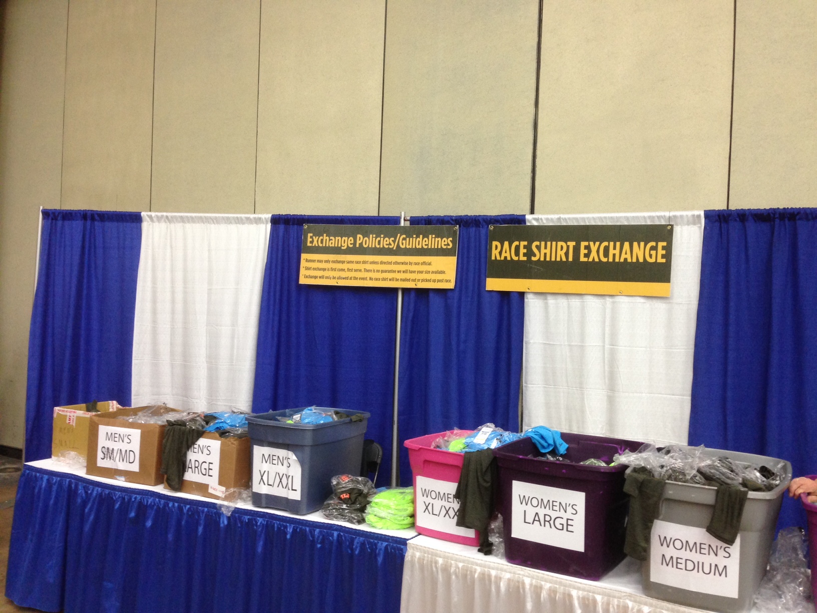 Once we got our bibs we headed into the expo to get our race shirts. Baltimore is the home city of Under Armor who also provided the official race apparel. I only have one piece of Under Armor gear (a compression under shirt that I wear on cold days to run) so wasn’t too familiar with their stuff although I knew the brand. I have to say that the race shirt was really nice. They didn’t skimp on the quality of any of the race apparel. When I signed up I had requested a men’s large shirt. When I tried this in it looked a little loose and baggy and I was wondering if they would let me exchange. One of the volunteers pointed me to an official exchange station. I thought this was quite a clever idea. I got to go over and try on the other sizes and exchange my shirt for a medium means still sealed in the bag. Nice.