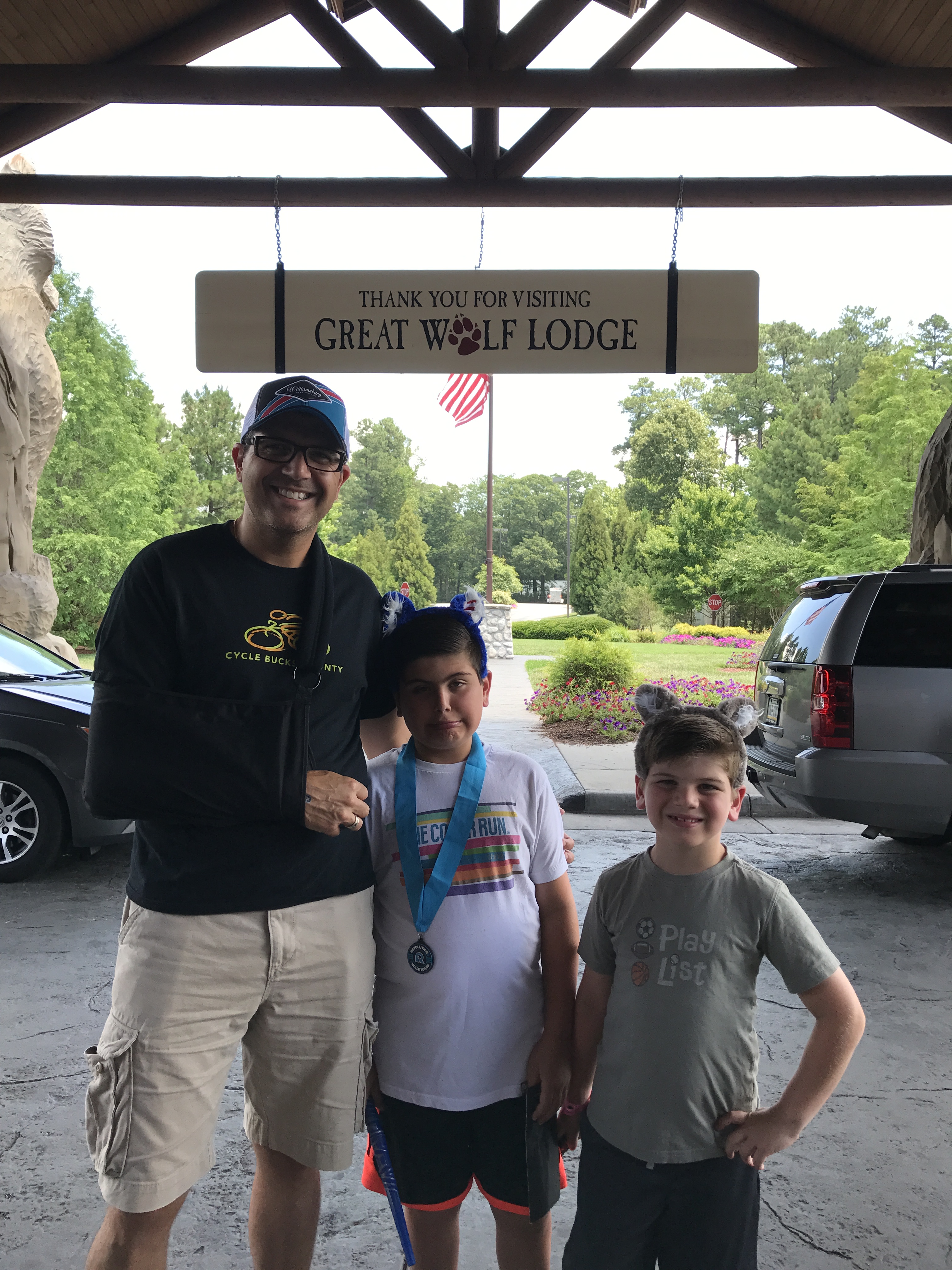A few days after the marathon, I got up early one morning and while getting my biking cleats on I managed to strain my sacroiliac joint. Ouch. Big ouch. I was laid out flat for two days unable to sit up. After three trips to the chiropractor in two days and lots of time laying on a heat pad I was finally up and moving again. After 9 days off (yeah…I know not a lot) I was running again. My wife was the race director for her company’s 5K (which was more like a 5.5K) and we all (me, both boys and my father in law) were taking part. I didn’t want to show myself up so I put the hammer down and ended up 3rd in my age group and 10th overall.