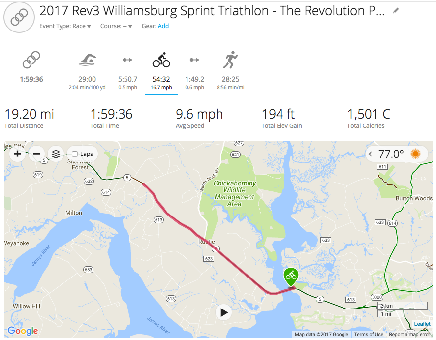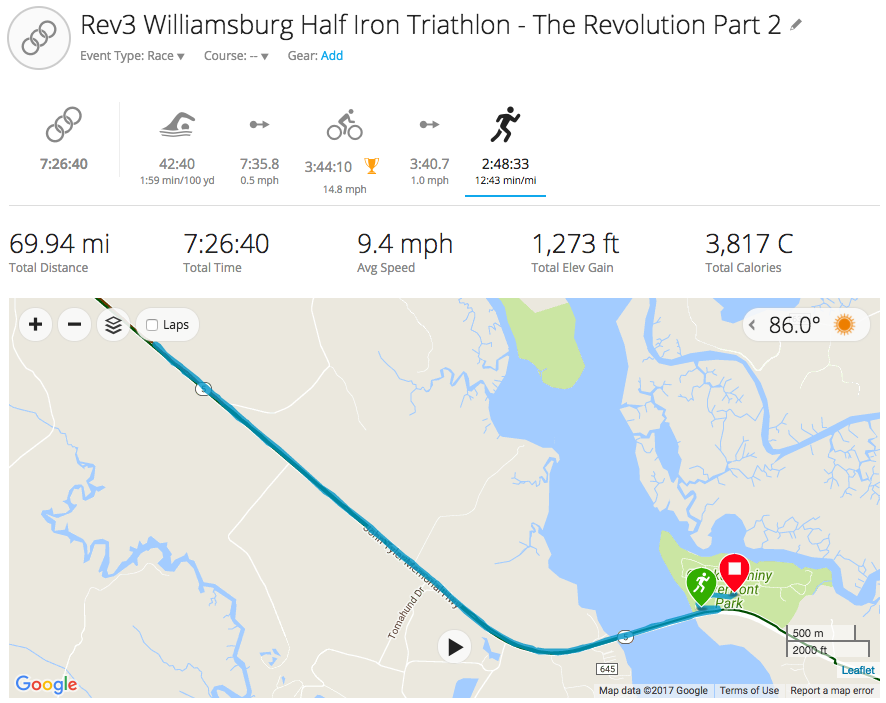 July – Rev3 Williamsburg Sprint and 70.3 Triathlons (another two-day challenge)