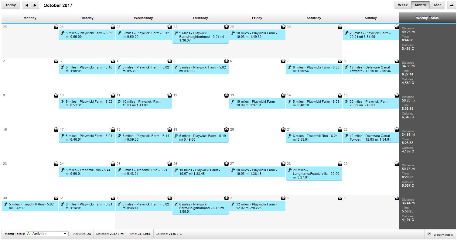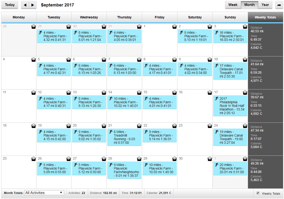 This was the peak of marathon training for me with the upcoming marathon at the beginning of October. Thankfully the weather was still great for most of the month. Cooler but not too cool. I had two races this month, the Hightstown Triathlon (my last triathlon of the season) and the Rock ‘n’ Roll Philadelphia Half Marathon (my 6th consecutive time running this race).
