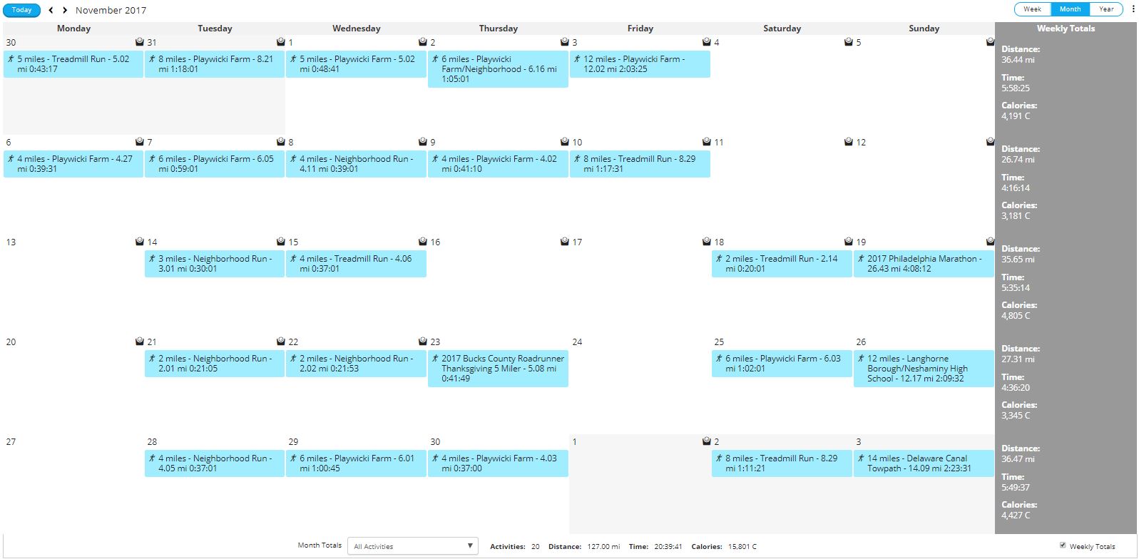 Saturday’s race was smooth and uneventful. I ran the half in 2:05:26. The goal was to enjoy myself, finish without any injury and not beat myself up too much for the next days marathon. Mission accomplished. On Sunday my wife and I ran the full marathon together. This was my 9th Philadelphia Marathon and my wife’s 3rd. It was the first time she had run the altered course which takes a more scenic route through Fairmount Park and eliminates the horrible out and back near my 16-17 which I always hated. The day was fun and we supported each other well. We finished in 4:45:17 which is consistent with the two other times we have run this together.