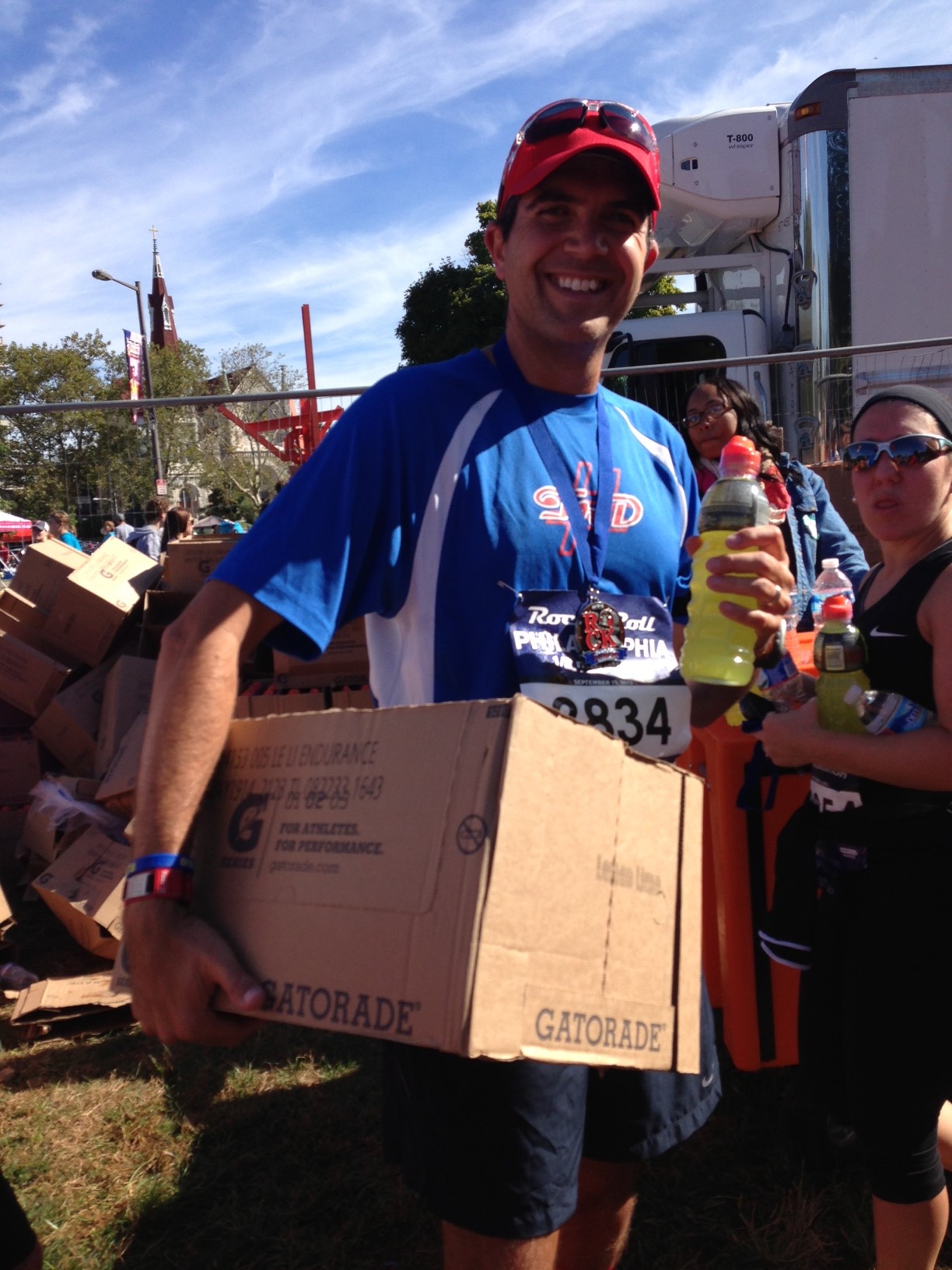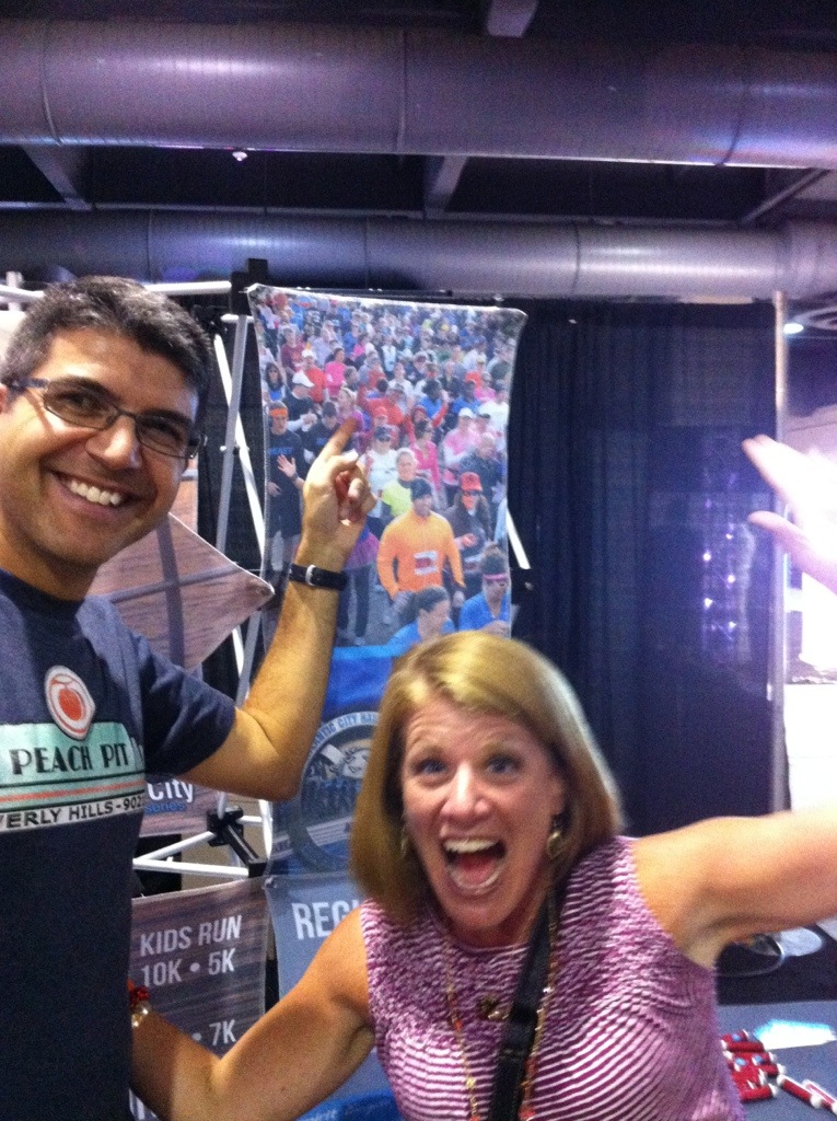 The post race village was just past the finish line. As this was not our fastest marathon (by far) some of the vendors had packed up. I am sure the faster runners had moved on as most people we saw just looked hot and tired. We grabbed a bagel and some Powerade and sat for a few minutes to catch our breath. There was a guy lying on the floor between the tables and he looked absolutely beat. At least I was still standing up (or sitting at this point).