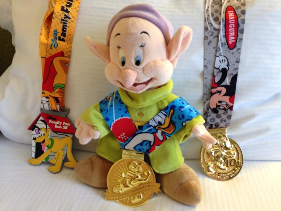 The Goofy Challenge earns you a Donald medal for the Half, a Mickey medal for the Full and a Goofy medal for completing both, a total of 3 medals.  Add in one more for the 5K and you walk away (slowly and with a limp probably) with 4 medals.  runDisney announced that by completing the Dopey Challenge you get the 5K medal, a Minnie themed medal for the 10K as well as the Donald, Mickey and Goofy and finally for completing all races you earn a new ‘Dopey’ medal.  That’s 6, count them, 6 medals.  Bling, bling, bling, bling, bling, bling (although the 5K is usually a rubber medallion so deduct a bling…it’s up to you).  That’s some serious hardware.  In addition to walking funny after all this mileage you’ll probably be stooped over from the weight around you neck 🙂