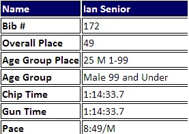 I was very fortunate that I hadn’t travelled alone to this race. I am not sure how I would have managed to get back from the race, go to the hospital or even drive home. My wife took the driving role as we left Williamsburg and even though we took an unexpected tour through Washington DC(?) we made it home in good time. I’d like to thank her for her infinite patience in putting up with all my training and putting up with what happened over this weekend.