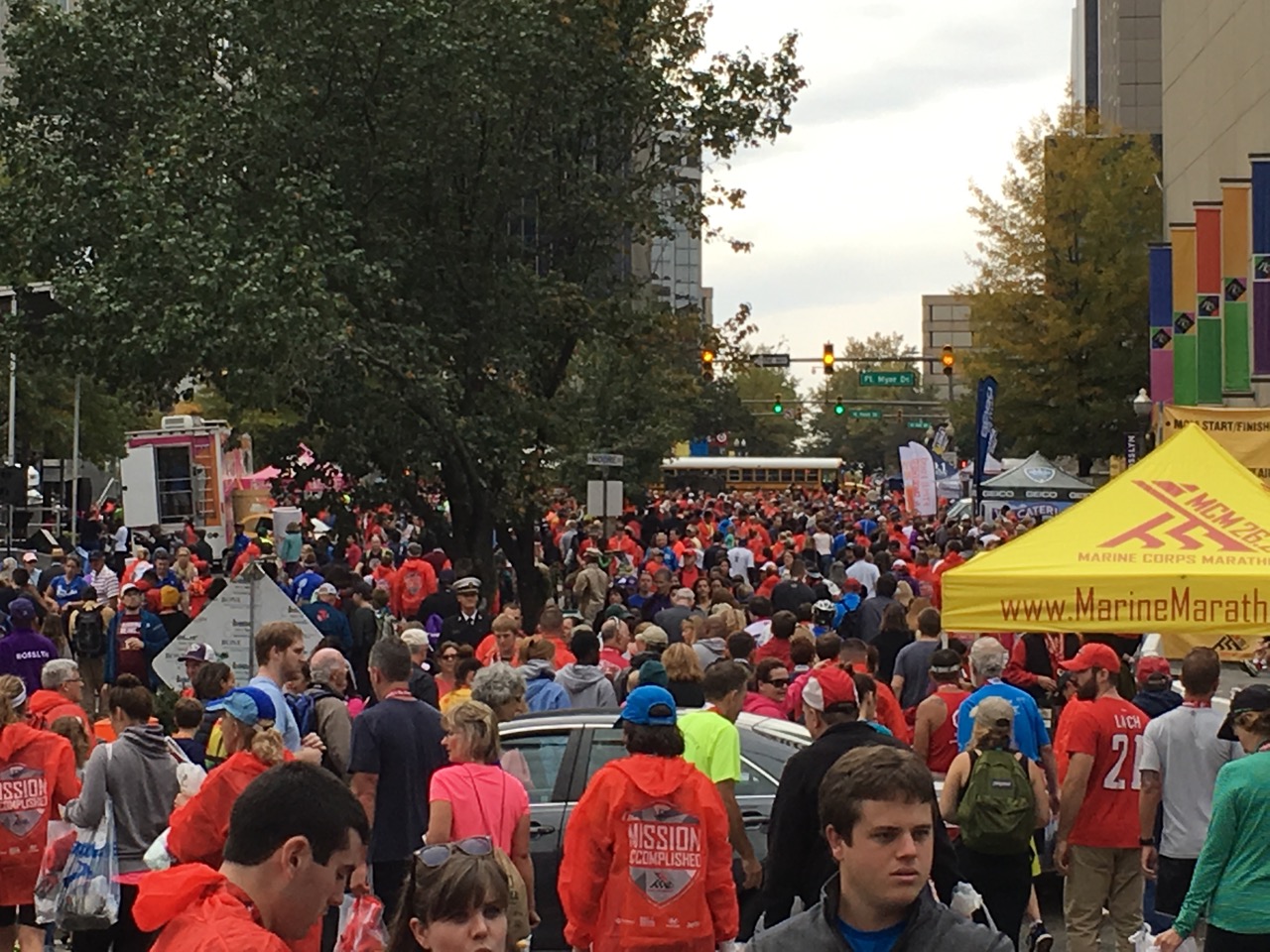 As we were close by to the start line we were able to walk from our hotel. We got up at a reasonable time (my wife would tell you too early) and made our way to the lobby (she refused to leave until she saw another runner pass through the lobby). My wife was wearing her New York City Marathon finisher blanket and I was wearing my father’s old dressing gown that he left on his last visit from the UK. It was nice and warm and worked perfectly (although I looked like an escaped mental patient walking the streets of D.C.).