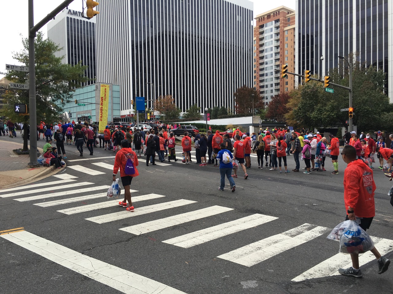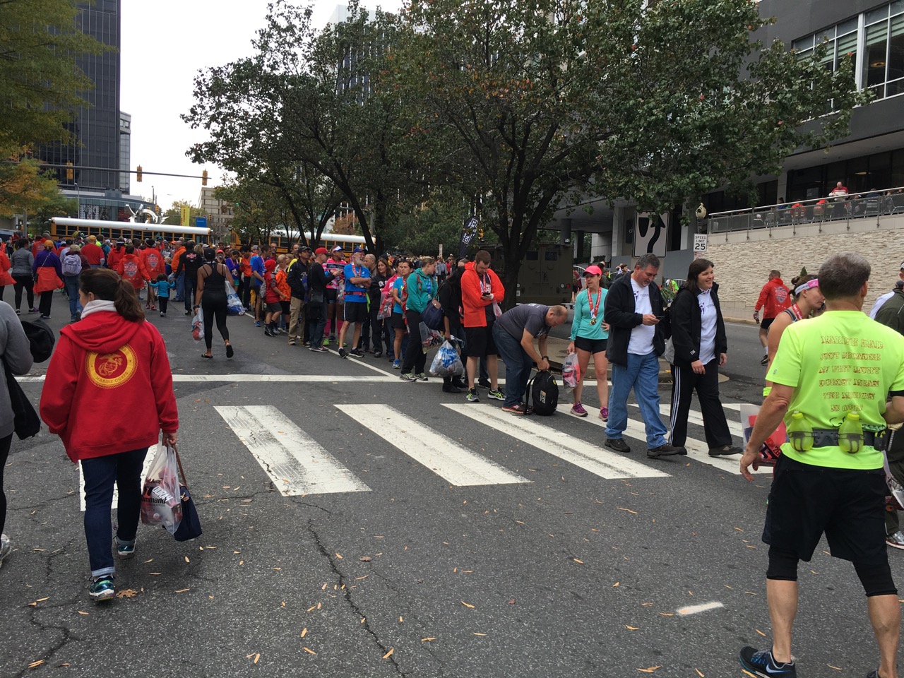 Once we had the jackets it was a matter of finding the shuttle back to the start. I had my tickets so I headed to the information booth. The lady at the information booth said that there were no shuttles and didn’t know what I was talking about. The map did however show a VIP shuttle area so we headed over to the VIP area to ask about the shuttles to the start line. No one had any idea what we were talking about. The map did say where they were supposed to be so albeit with little help from anyone who knew anything about RFK stadium we made our way to where the shuttles were said to be parked. There was a lot of walking involved….and stairs. We were not happy (or optimistic at this point).