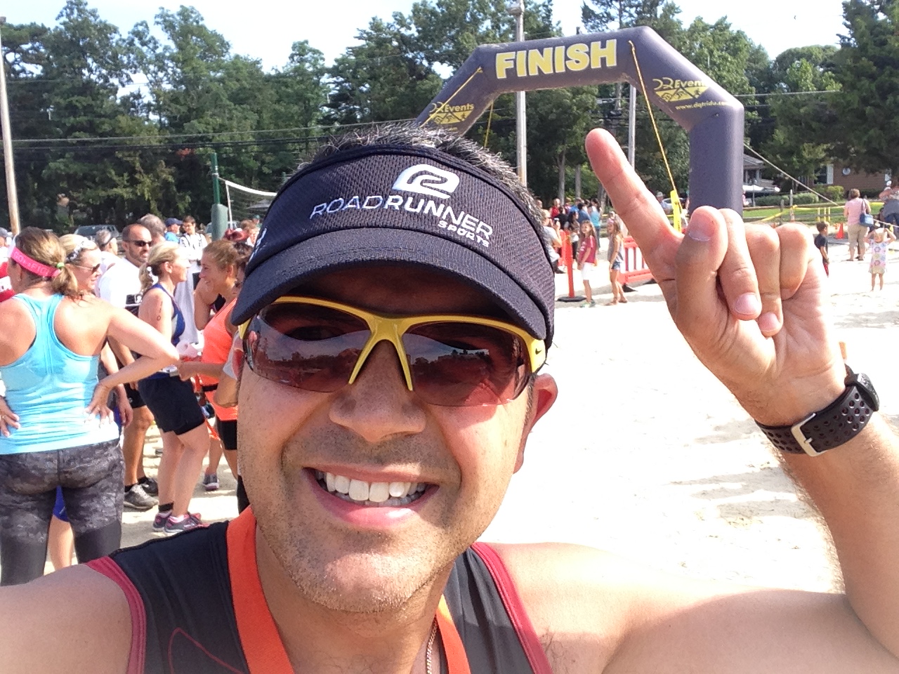 Water was handed out to us as soon as we crossed the line. The race also had a mist tent beyond the finish line. Essentially a big tented area spraying cold water on participants. Let’s just say it was very well utilized. While we stood in line for the food tent, volunteers were handing out ice pops to all participants to help cool down. I grabbed my refreshments and headed back to the transition to sit for a while, catch my breath and try and cool down. Not easy.