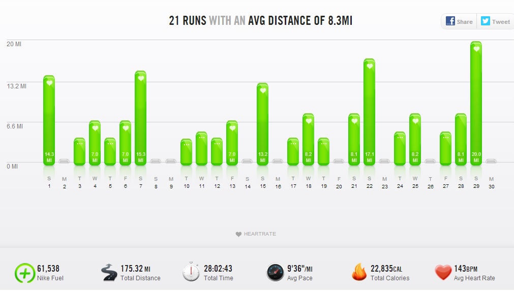 Week 15 is now over. This included the last long run of the training program (20 miles).